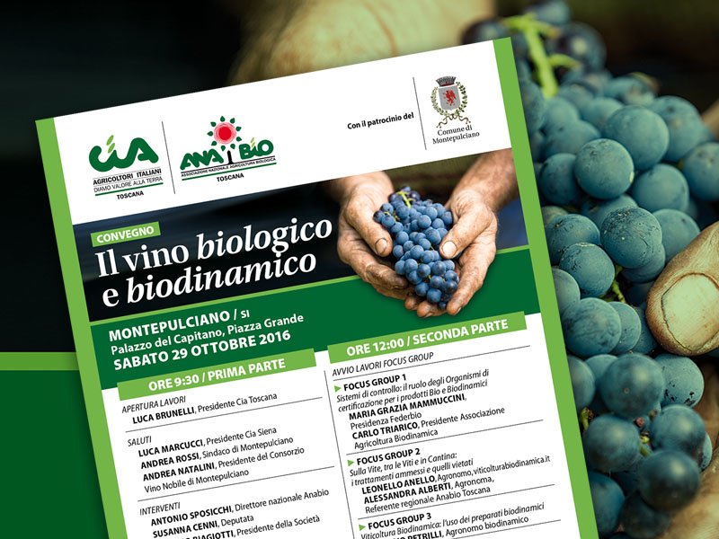 Sabato 29 ottobre 2016 dalle ore 9:30 al Palazzo del Capitano (Piazza Grande) di Montepulciano (SI) il convegno organizzato da Cia Toscana e Anabio Toscana dal titolo “Il vino biologico e biodinamico”, con il patrocinio del Comune di Montepulciano. Vai alla pagina per registrarti al convegno.
