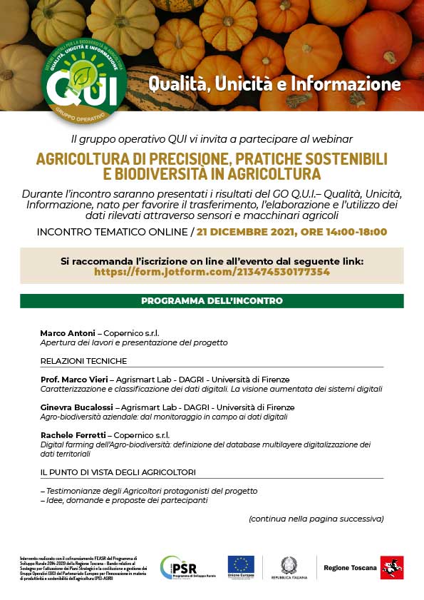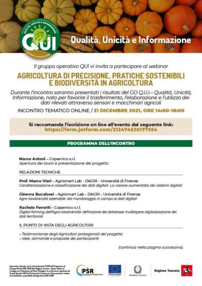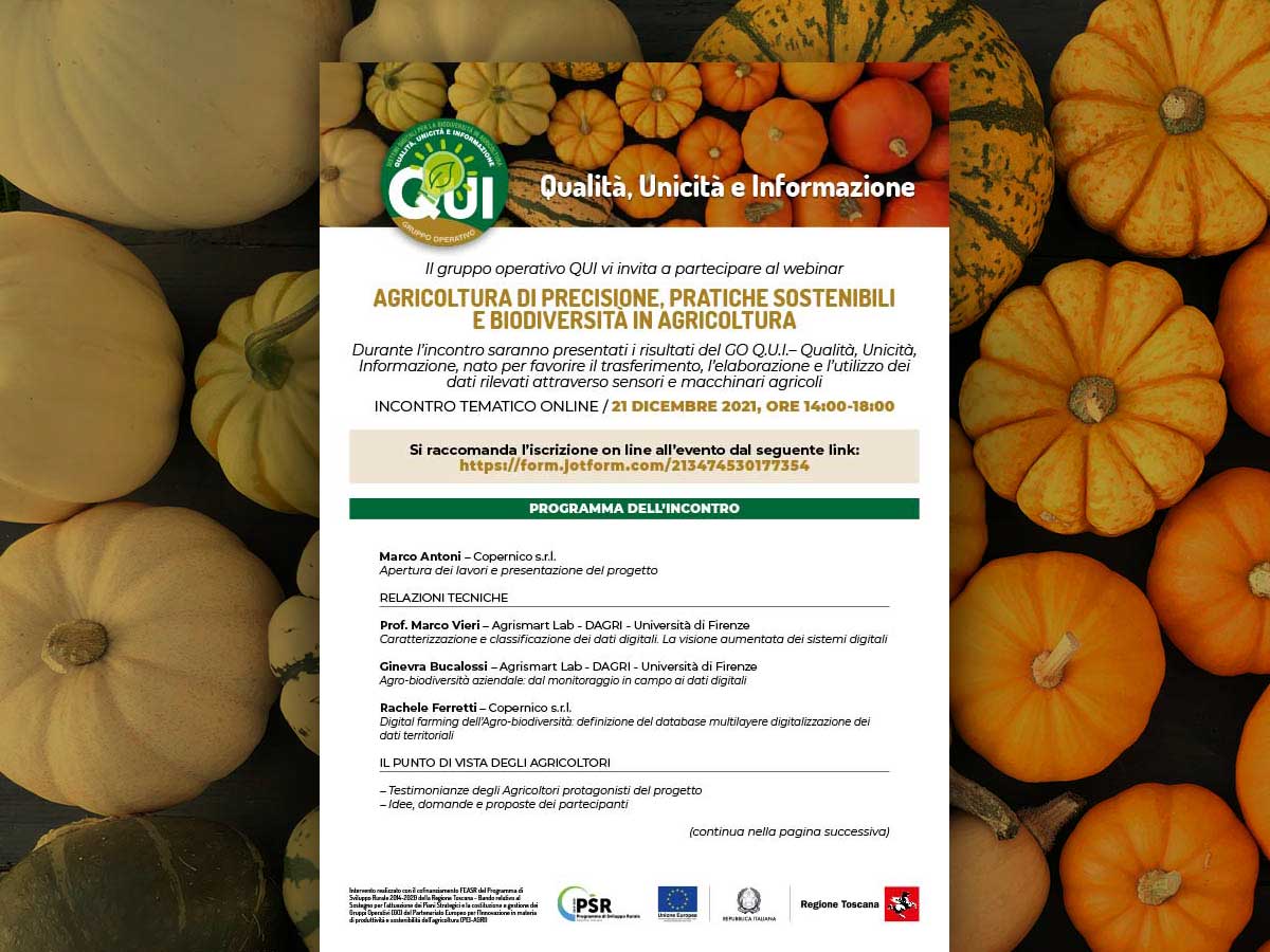 Il gruppo operativo QUI vi invita a partecipare al webinar “Agricoltura di precisione, pratiche sostenibili e biodiversità in agricoltura”.