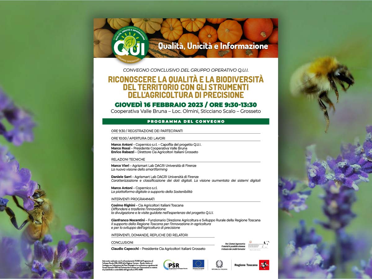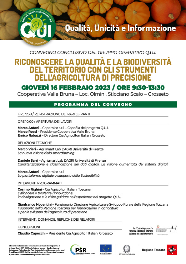Appuntamento Giovedì 16 febbraio 2023 / ore 9:30-13:30 alla Cooperativa Valle Bruna – Loc. Olmini, Sticciano Scalo – Grosseto per il convegno conclusivo del Gruppo Operativo QUI “Riconoscere la qualità e la biodiversità del territorio con gli strumenti dell’agricoltura di precisione.
