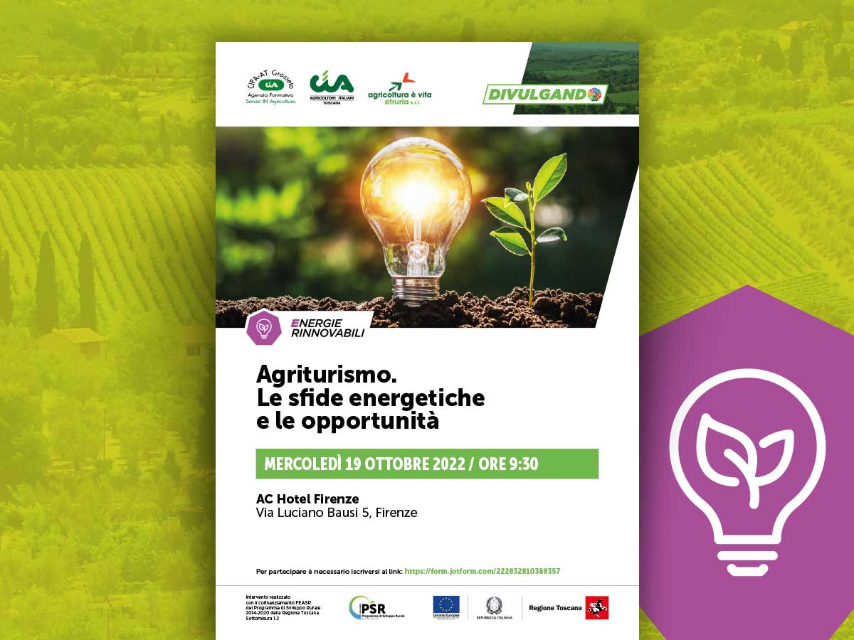 Appuntamento mercoledì 19 ottobre 2022 alle ore 9:30 all’AC Hotel Firenze (Via Luciano Bausi 5, Firenze) con il convegno dal titolo “Agriturismo. Le sfide energetiche e le opportunità”.