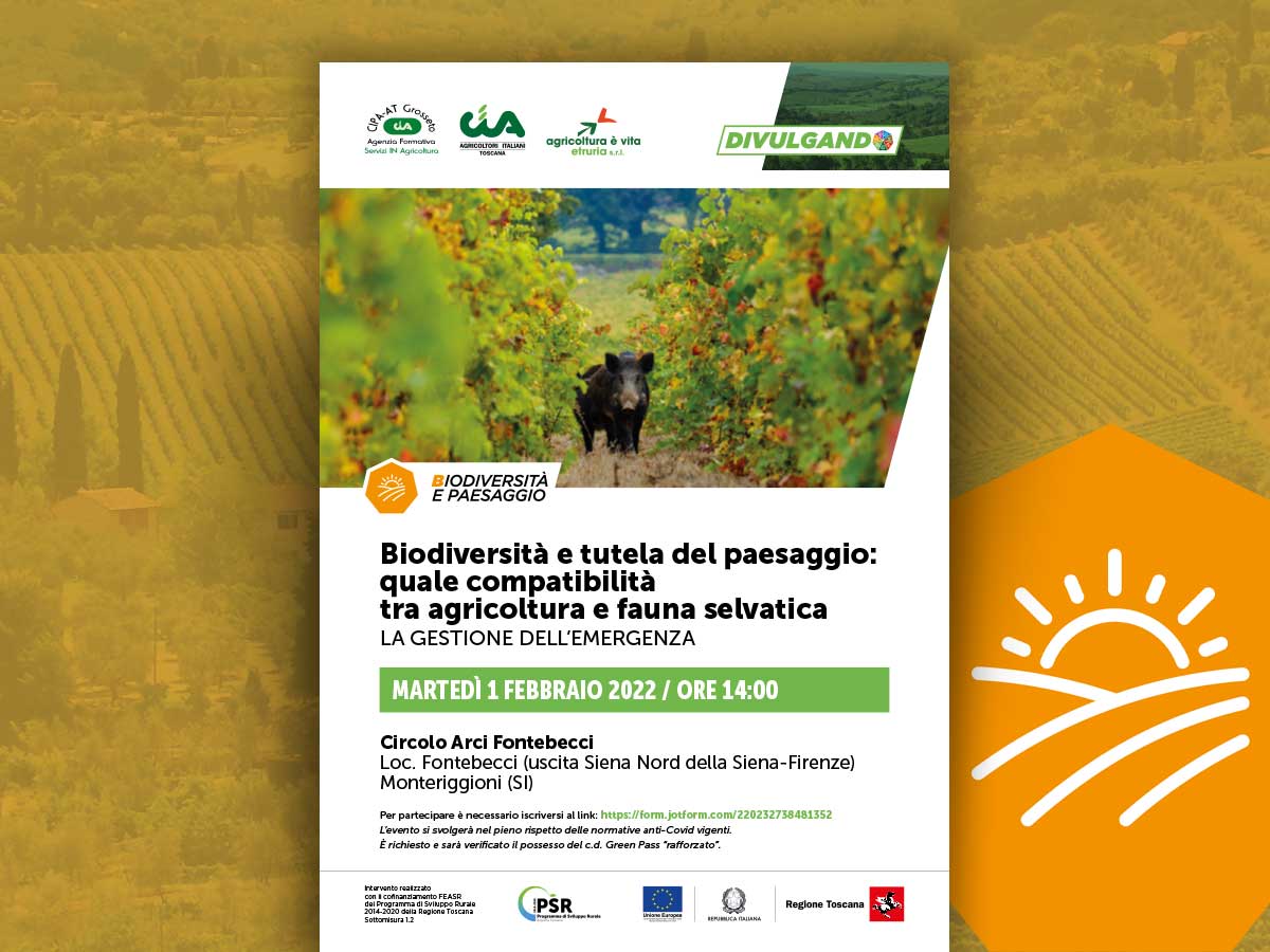 Appuntamento martedì 1 febbraio 2022 alle ore 14:00 al Circolo Arci Fontebecci (Loc. Fontebecci, uscita Siena Nord della Siena-Firenze, Monteriggioni, Siena) per il seminario “Biodiversità e tutela del paesaggio: quale compatibilità tra agricoltura e fauna selvatica. La gestione dell’emergenza”.