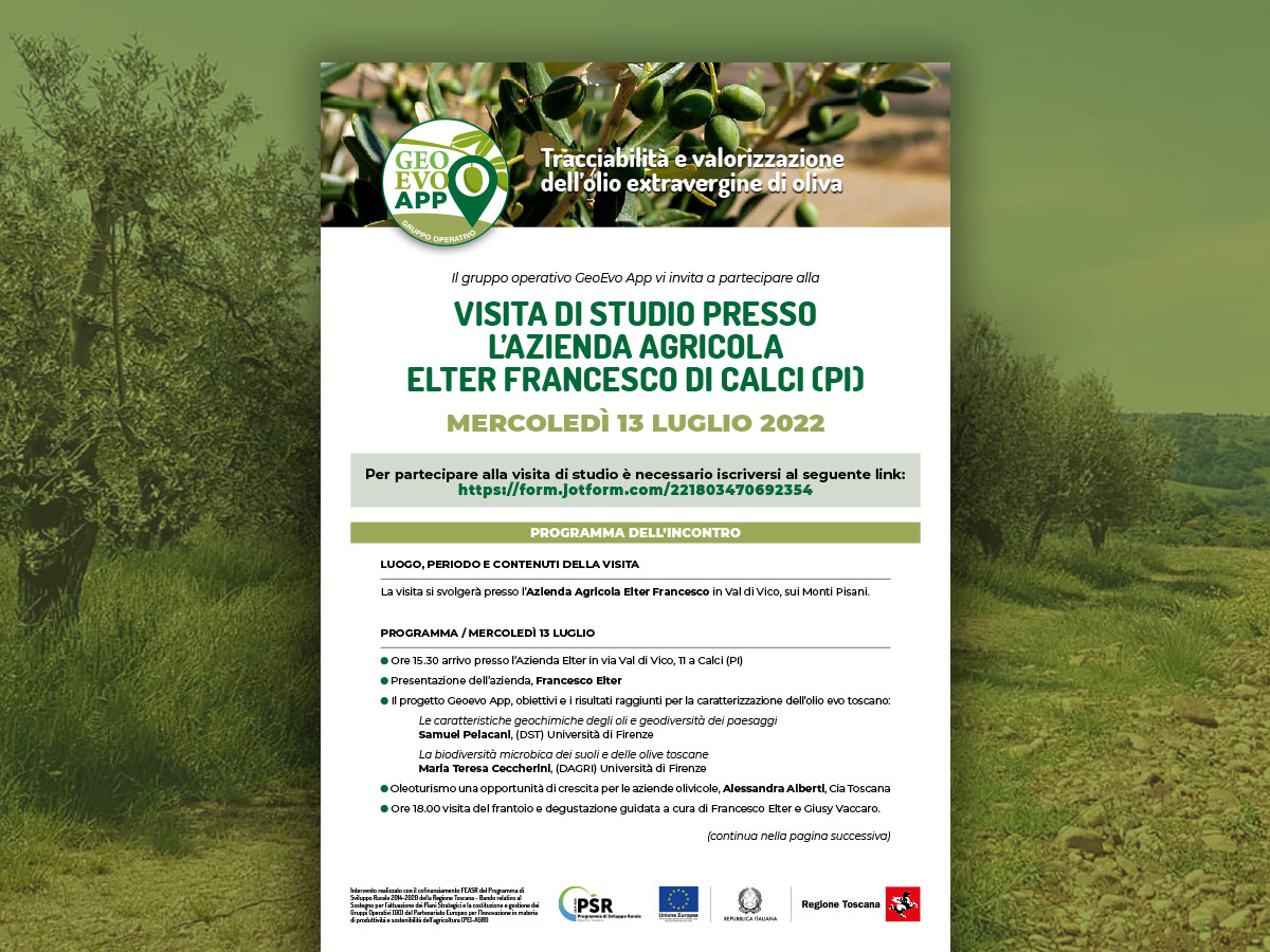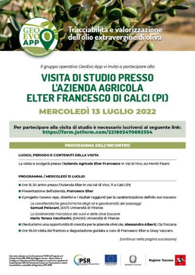 Il gruppo operativo GeoEvo App vi invita a partecipare alla visita di studio presso l’azienda Agricola Elter Francesco di Calci (Pi) prevista per mercoledì 13 luglio 2022.