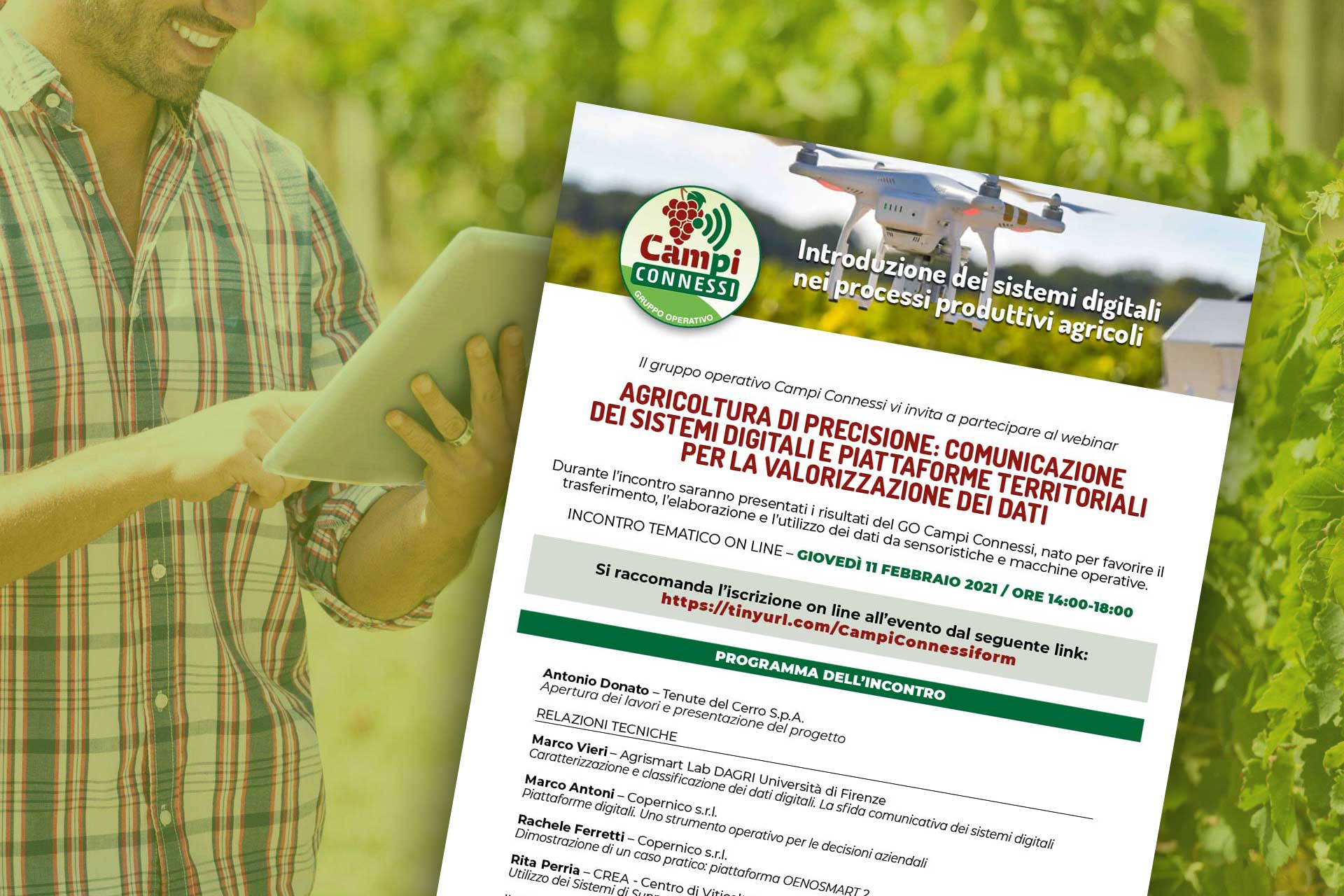 Il gruppo operativo Campi Connessi organizza per giovedì 11 febbraio 2021, un incontro tematico on line dal titolo “Agricoltura di precisione: comunicazione dei sistemi digitali e piattaforme territoriali per la valorizzazione dei dati”.