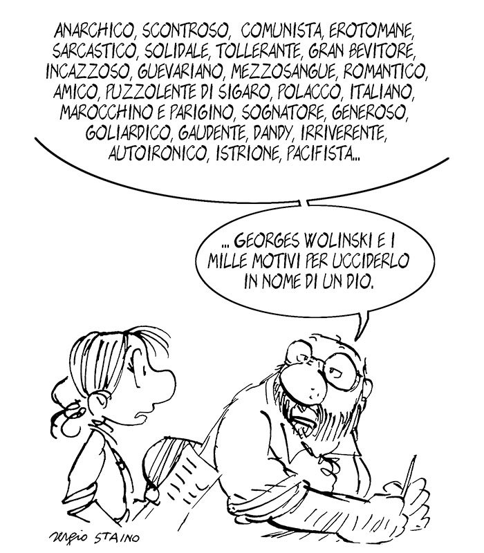 Nel blitz del 7 gennaio, sotto i colpi di kalashnikov al grido di “Allah è grande” è caduto anche il fumettista francese Georges Wolinksi. Staino e Wolinksi erano amici, molto amici. Si sono frequentati per anni e hanno lavorato insieme. In questo numero oltre alla vignetta di prima pagina – fatta come sempre in esclusiva per Dimensione -; ne pubblichiamo una seconda, che Staino ha realizzato per ricordare l’amico. «Mi meraviglia e mi terrorizza che certe persone abbiano così paura del nostro mestiere basato sull’intelligenza e contro l’oscurantismo» ha detto Staino ricordando Wolinksi.