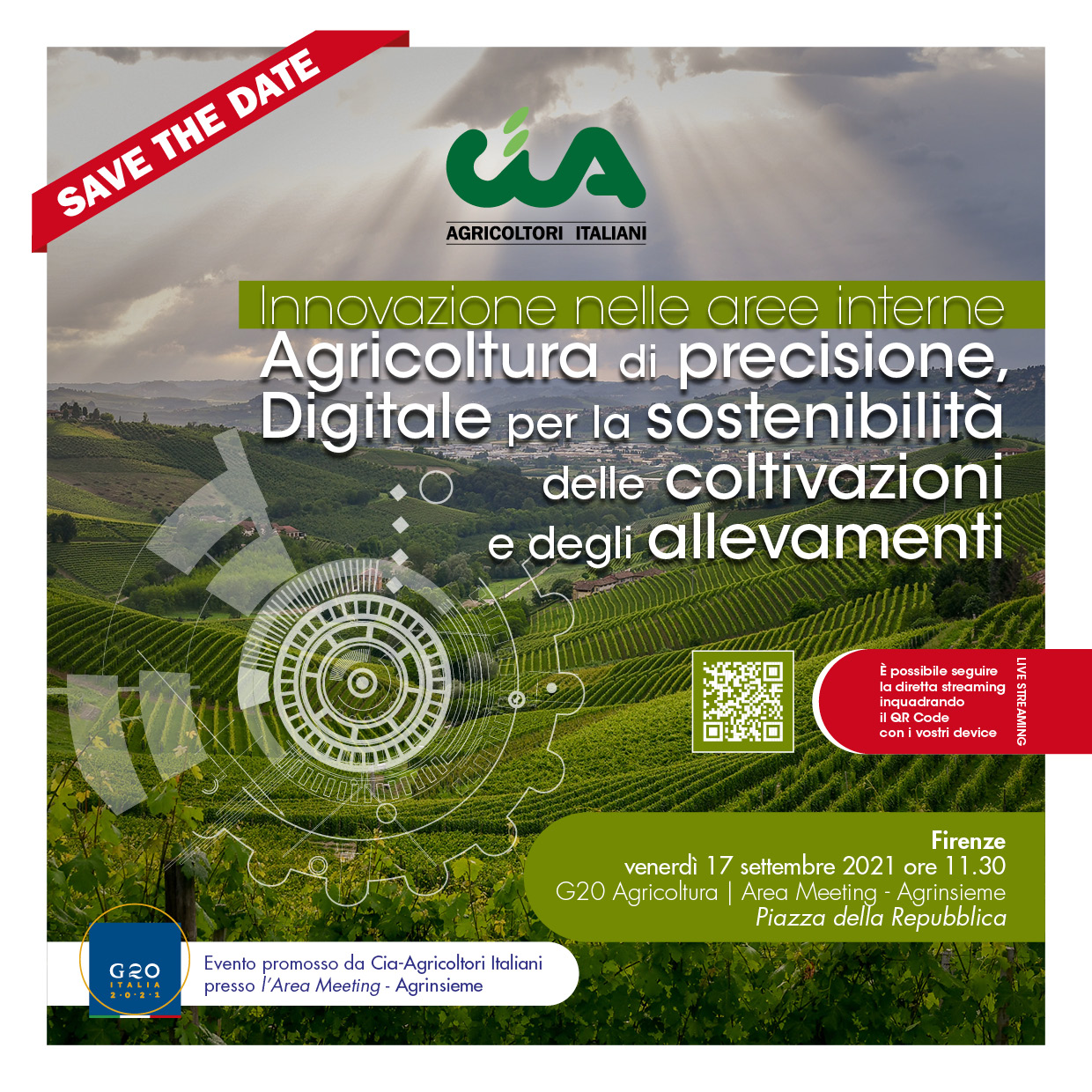Si svolgerà venerdì 17 settembre 2021 ore 11.30 a Firenze (Area Meeting – Agrinsieme | Piazza della Repubblica), in concomitanza con il G20 Agricoltura, l’iniziativa di Cia Agricoltori Italiani dal titolo “Innovazione nelle aree interne. Agricoltura di precisione, Digitale per la sostenibilità delle coltivazioni e degli allevamenti”.