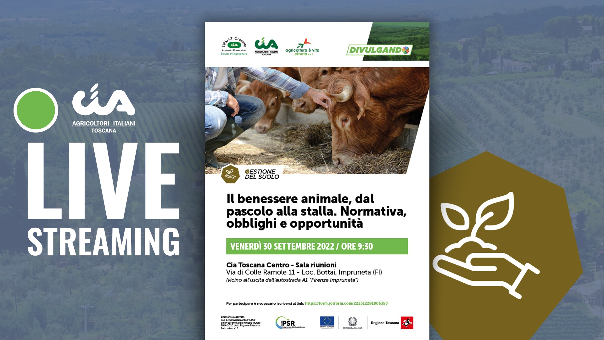 ULTERIORI INFORMAZIONI SUL CONVEGNO QUI: https://www.ciatoscana.eu/home/il-benessere-animale-dal-pascolo-alla-stalla-normativa-obblighi-e-opportunita/