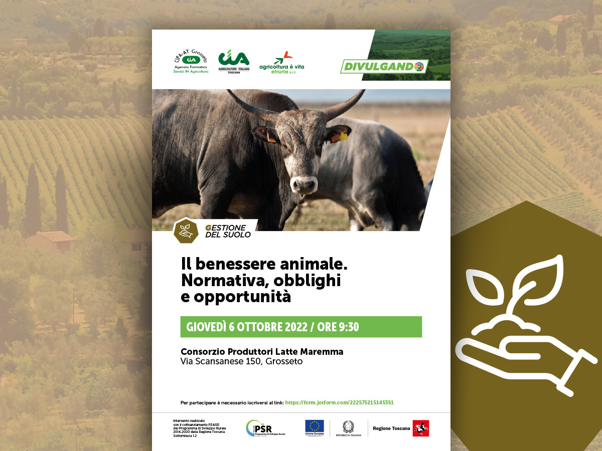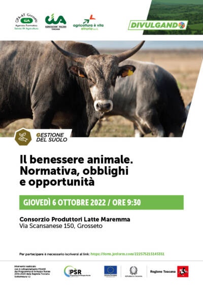 Appuntamento giovedì 6 ottobre 2022 alle ore 9:30 a Consorzio Produttori Latte Maremma (Via Scansanese 150, Grosseto) con il convegno dal titolo “Il benessere animale. Normativa, obblighi e opportunità”.