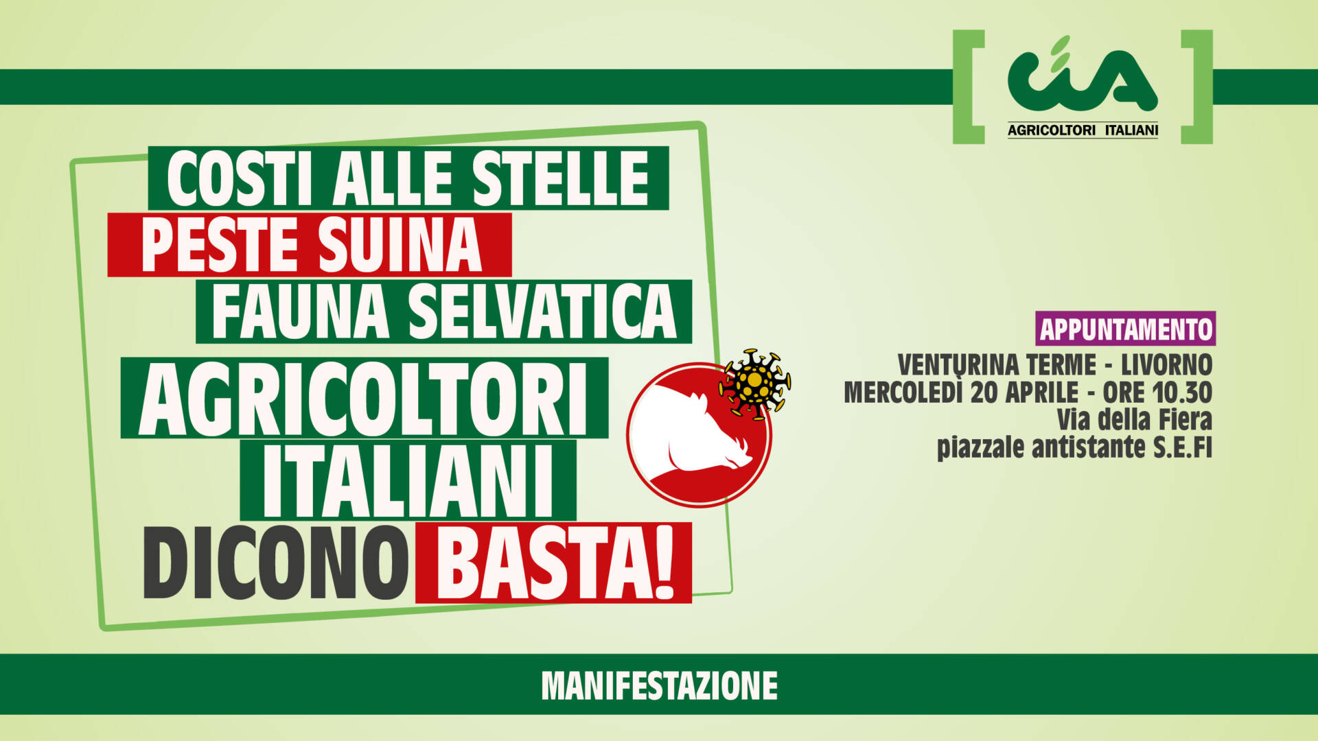 Nuova e terza manifestazione di Cia-Agricoltori Italiani contro costi di produzione alle stelle, peste suina ed emergenza fauna selvatica. A mobilitarsi, scendendo in strada tra bandiere e trattori, questa volta sono gli imprenditori agricoli del Centro Italia che si sono dati appuntamento mercoledì 20 aprile, alle ore 10.30, a Venturina Terme, frazione del comune di Campiglia Marittima, in provincia di Livorno.