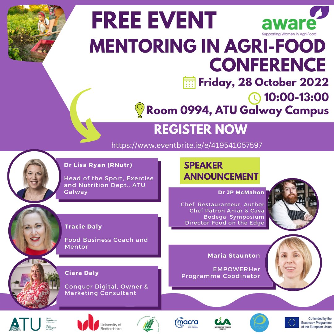La conferenza gratuita “Mentoring in Agri-Food” si svolgerà venerdì 28 ottobre 2022 al Galway City Campus dell’Atlantic Technological University.