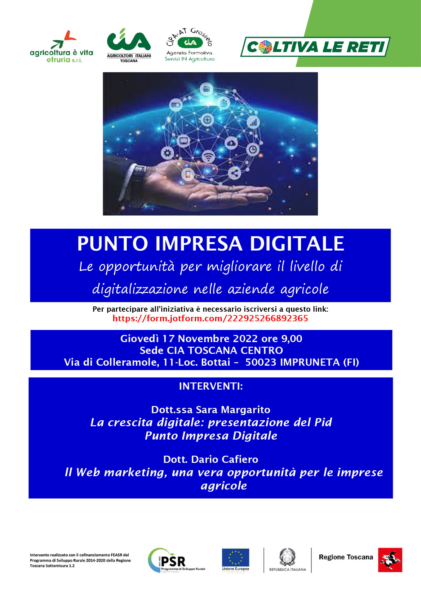 Le opportunità per migliorare il livello di digitalizzazione nelle aziende agricole. Se ne parlerà in un incontro organizzato da Cia Toscana Centro alla sede di Bottai in via di Colle Ramole 11 (vedi nella sezione “Sedi”) per giovedì 17 novembre 2022 a partire dalle ore 9:00.