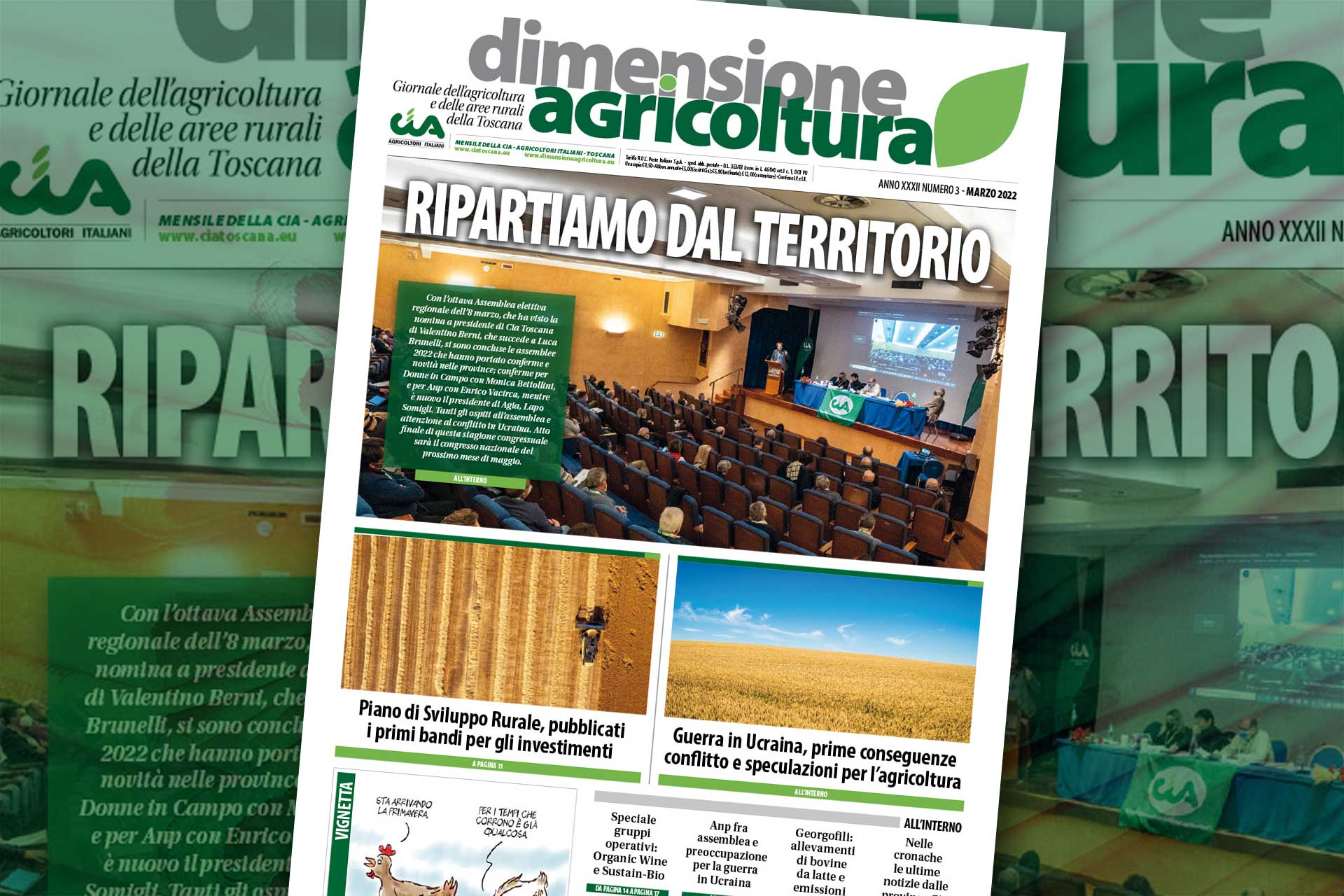 - Ripartiamo dal territorio. Con l’ottava Assemblea elettiva regionale dell’8 marzo, che ha visto la nomina a presidente di Cia Toscana di Valentino Berni, che succede a Luca Brunelli, si sono concluse le assemblee 2022 che hanno portato conferme e novità nelle province; conferme per Donne in Campo con Monica Bettollini, e per Anp con Enrico Vacirca, mentre è nuovo il presidente di Agia, Lapo Somigli. Tanti gli ospiti all’assemblea e attenzione al conflitto in Ucraina. Atto finale di questa stagione congressuale sarà il congresso nazionale del prossimo mese di maggio.